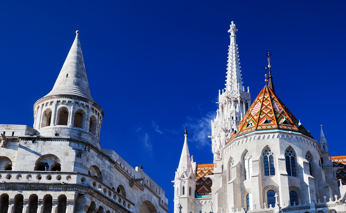 ●【马加什教堂】外观,马加什教堂外观属新歌德式,其蕴含了匈牙利民俗、新艺术风格和土耳其设计等多种色彩,精雕细琢装饰的石造尖塔与色彩缤纷的马赛克镶嵌屋顶是这教堂的特色。教堂独具匠心地将高高的钟楼修建在教堂的一角,这使得整座建筑一下子变得轻盈,少了其他教堂的沉重与拘谨。历代匈牙利国王的加冕仪式皆在此举行,故又有“加冕教堂”之称。