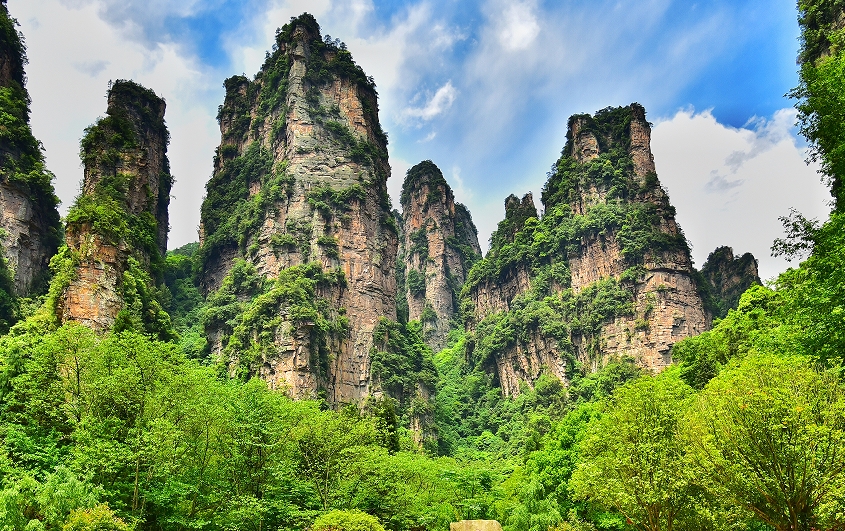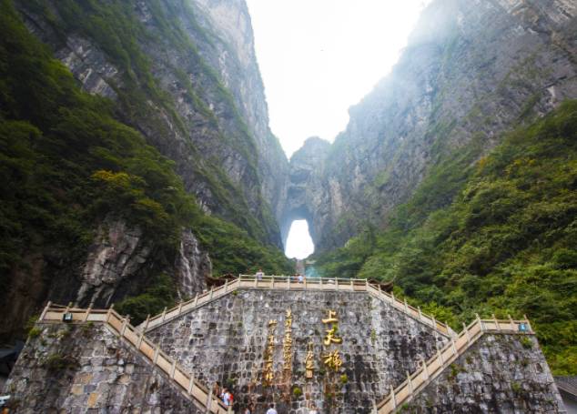 下午:中餐后前往游览张家界国家森林公园精华线路(游览时间约 3.5 小时),前往【百龙天梯】(赠送单程)乘全暴露观光缆车·最高户外电梯·体验 66 秒直达山顶,挑战你的心速!抵达山顶后游览世界自然遗产的核心【袁家界风景区】袁家界位于杉刀沟北麓,是以石英岩为主构成的一座巨大而较平缓的山岳,既有石丛小涧、银瀑高泻,又有竹林繁茂、苍松垂壁。由于水丰林密,空气极为清新。是张家界公园又一处风景集中地。