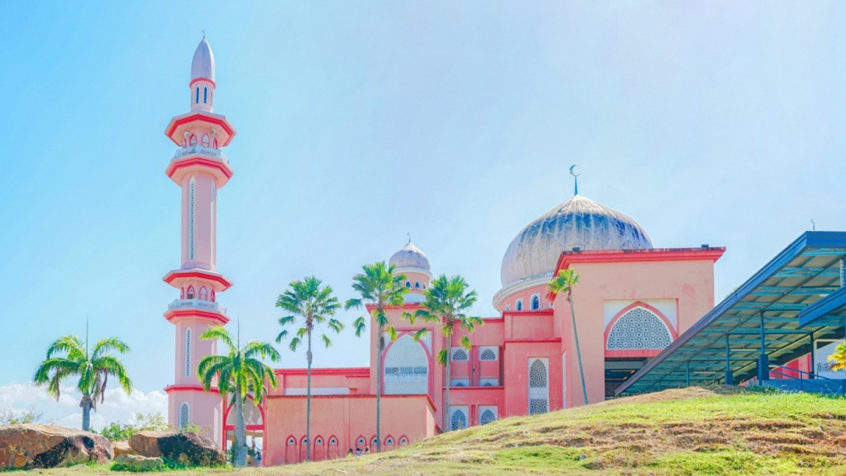 沙巴大学粉红清真寺(外观),其设计相当环保,祈祷大厅非常宽敞,内有 12 根柱子,柱子中心都是真空设计,天气炎热时可以从湖底马达运转抽风而上入内,所以进入清真寺内时会有微凉的感觉。