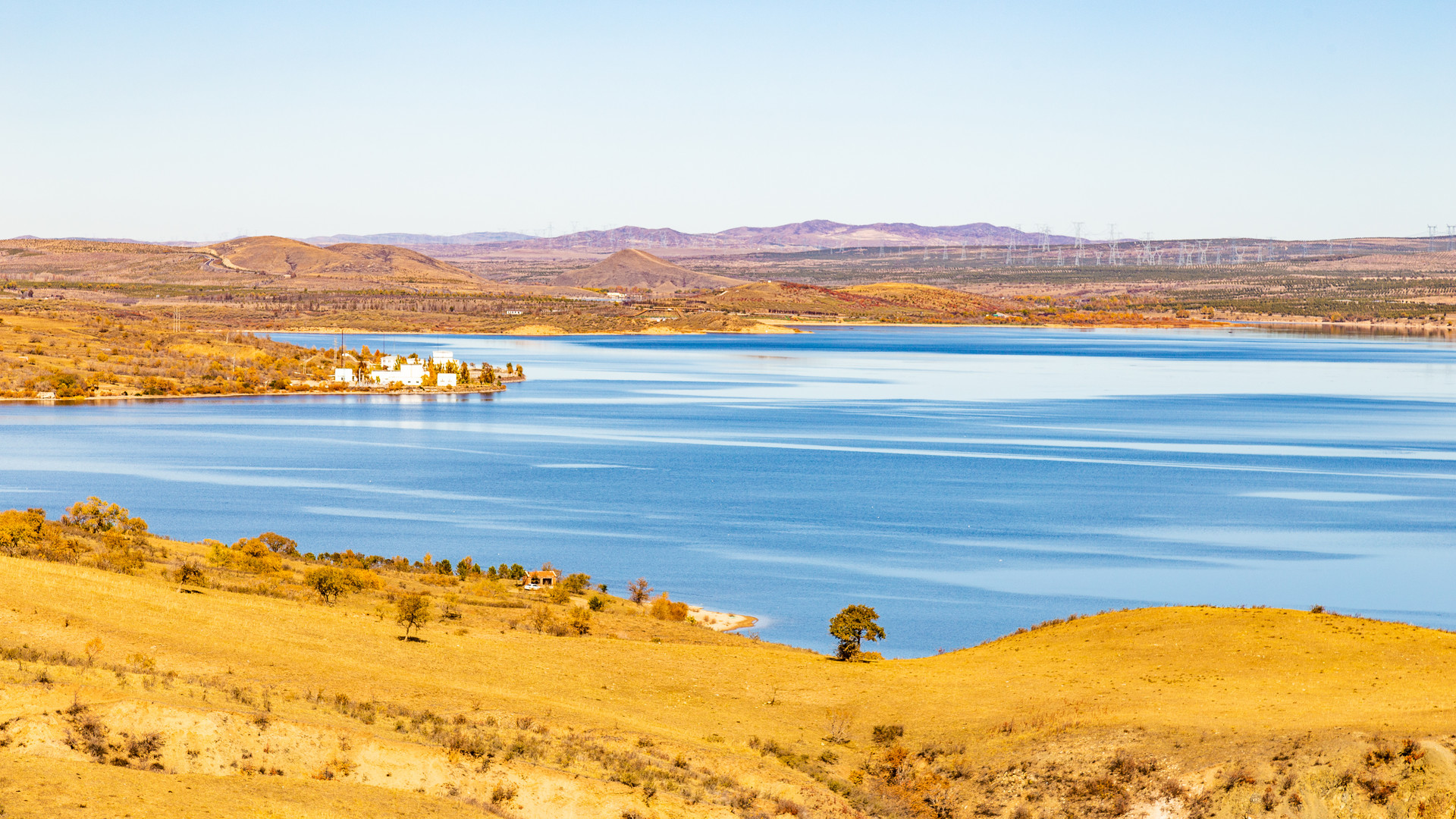 【金蝉湖白桦倒影】白桦林满树金黄、湖水波湛蓝、山坡斑斓如画、绵延的山丘线条流畅,以及低头吃草的牛羊,共同构成了一幅幅色彩斑斓的大地景观。