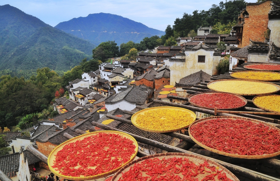 婺源篁岭鲜花小镇:晒秋人家,挂在山坡上的古镇、一幅流动的缩写版“清明上河图”