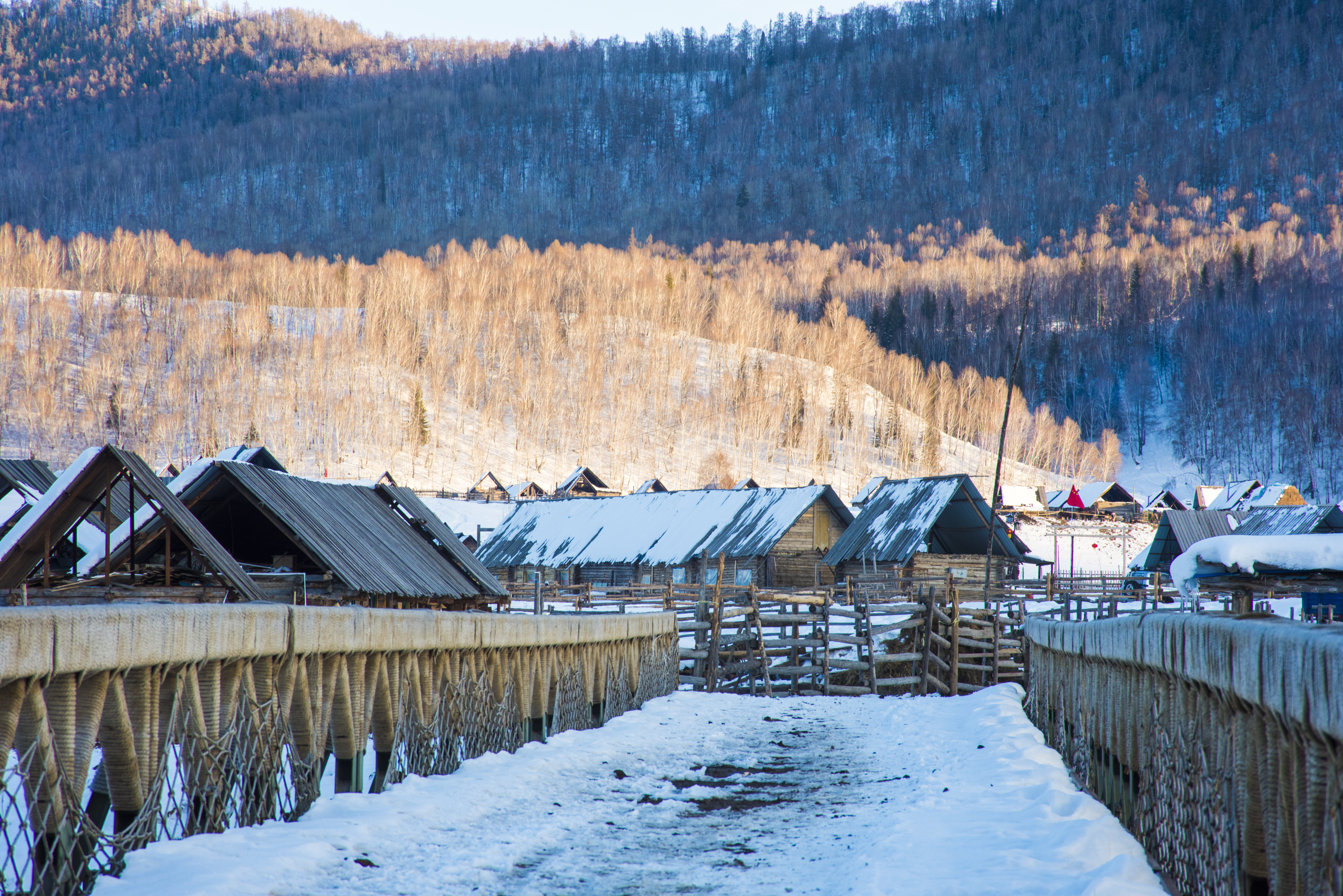 清晨登上禾木观景平台,看朝阳刺破晨雾:金色光辉洒向村落,积雪覆盖的木屋泛着柔光,袅袅炊烟从烟囱升起,与薄雾缠绕,整幅画面似水墨丹青,治愈人心;可在雪地打滚、玩泼水成冰,体验当地人的童年乐趣。