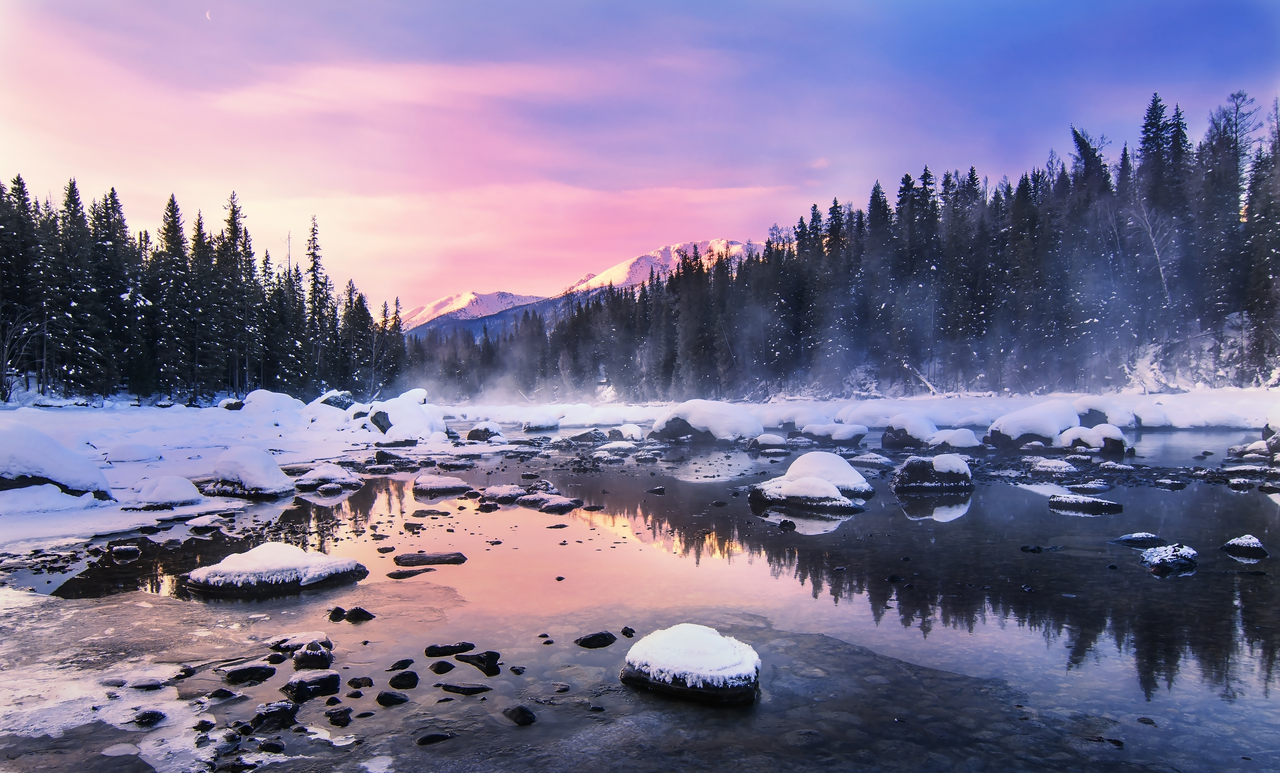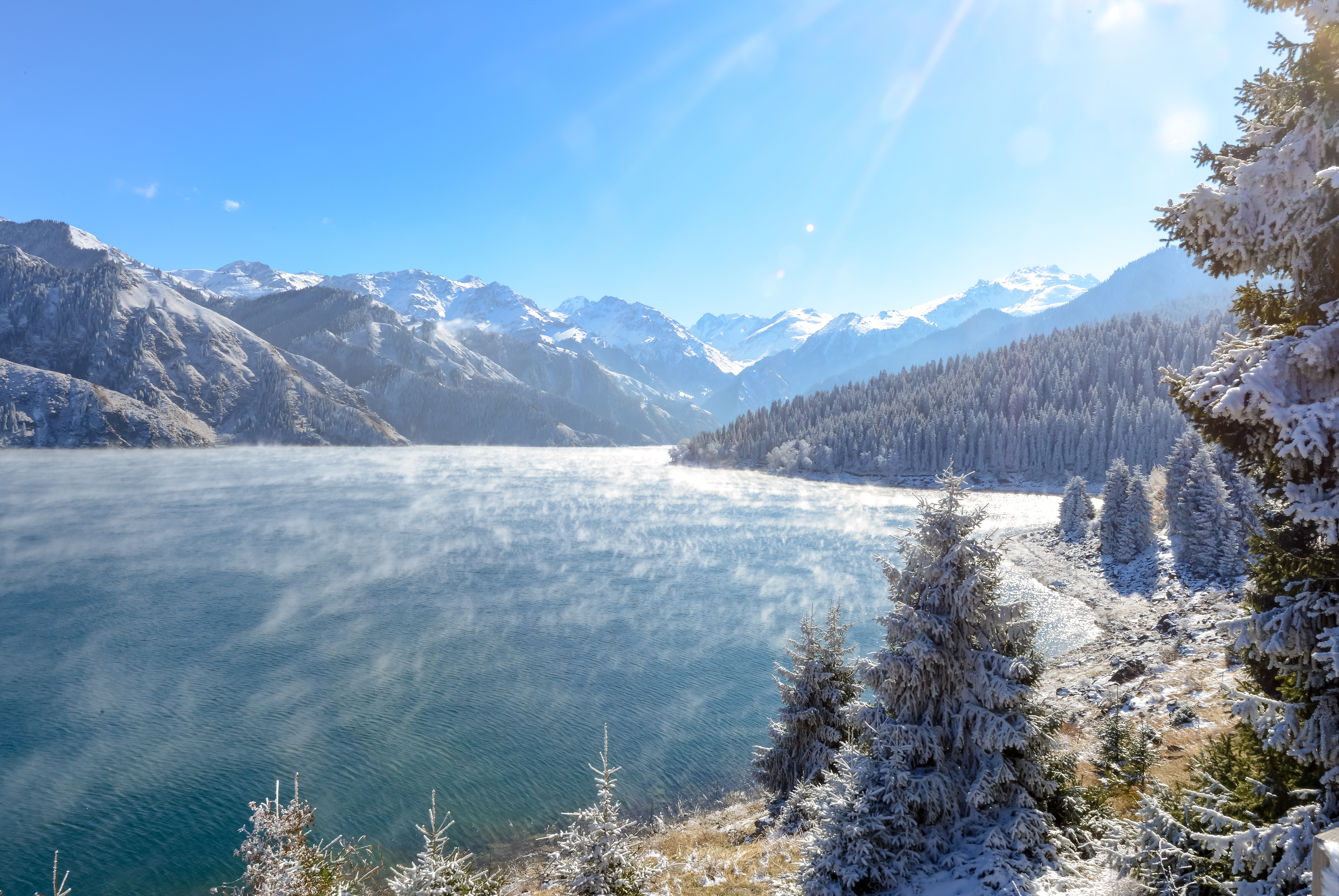 冬日喀纳斯人迹罕至,似梦幻童话——莽莽雪原、晶莹桦林雾凇、皑皑冰湖与炊烟村庄相映,可沿喀纳斯河漫步享悠闲。清晨湖畔栈道旁,雾凇绵延,湖面冒氤氲水汽,阳光穿雾凇照冰面,仙气十足;湖边雪覆石头如可爱白 “蘑菇”。冬日三湾(蜿蜒曲折的卧龙湾、晨雾缭绕的月亮湾、雾凇密集的神仙湾)景致绝佳,幸运的话可在月亮湾遇通晓人性的赤红灵狐,近距离观察拍照。