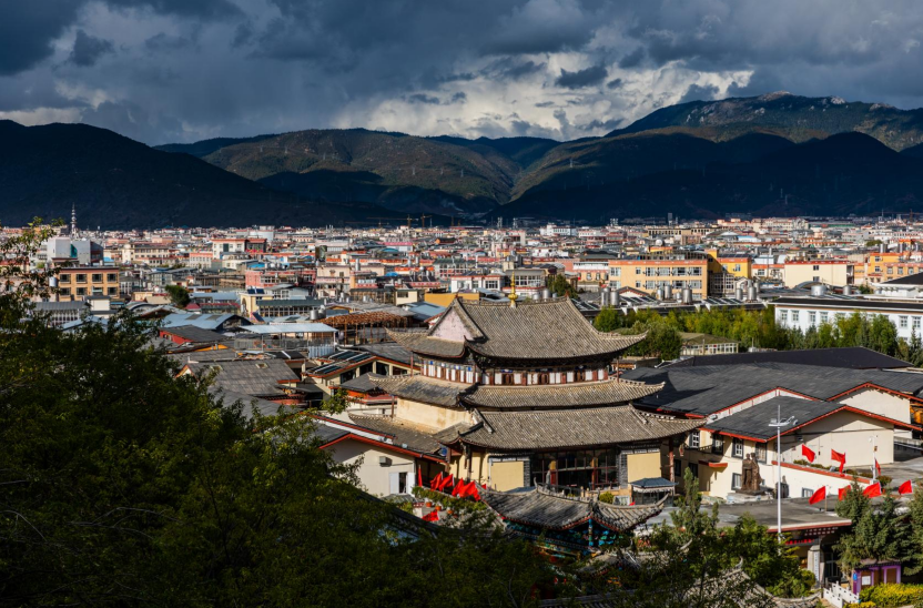 4、后游览“月光城”【独克宗古城】,可登山古城一侧的【龟山公园】,转动大转经筒祈福 ,俯瞰古城全貌。您也可以在古城,品尝当地特色小吃。