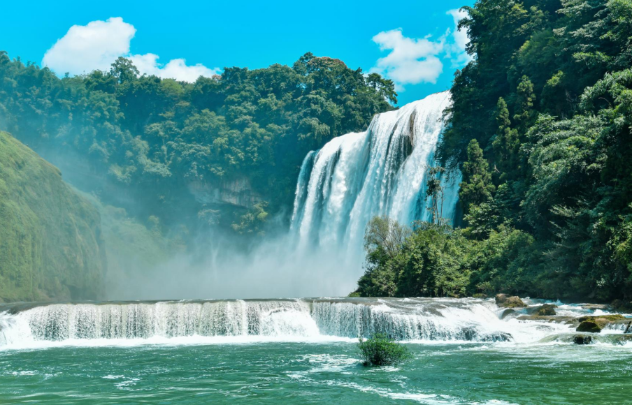 黄果树瀑布群中瀑顶最宽的瀑布,也是 1986 版《西游记》片尾曲取景地;乘坐观光车游览,平水期可见水流沿百米钙化滩坝均匀散开,如 “半透明面纱”“素绢扇面” 般轻盈舞动,粼粼波光中尽显清秀妩媚。