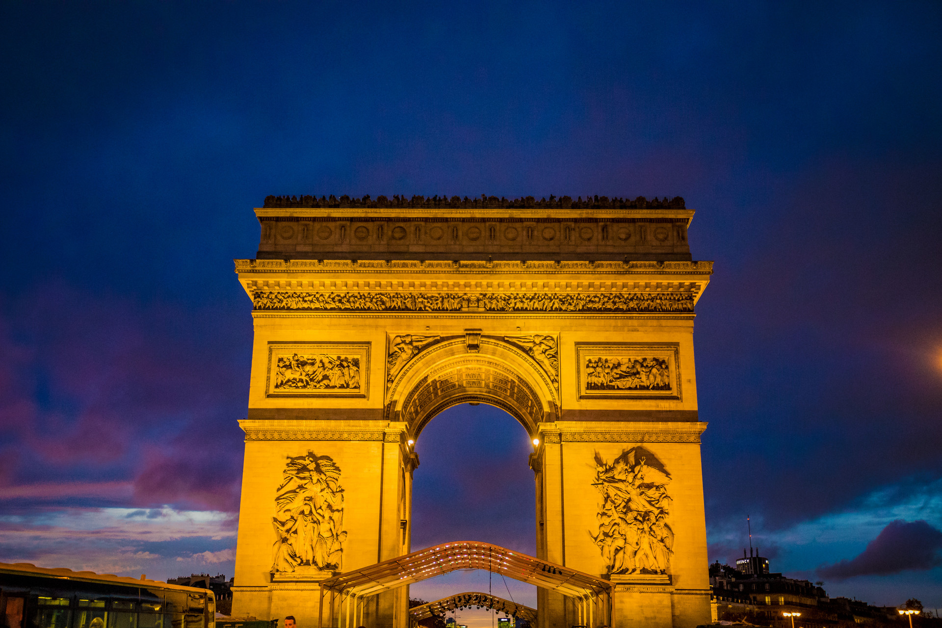 【凯旋门】外观,巴黎凯旋门是巴黎市的四大代表建筑之一(埃菲尔铁塔、凯旋门、卢浮宫和巴黎圣母院),也是目前香榭丽舍大街上最大的一座圆拱门,是为了纪念拿破仑在 1806 年在奥斯特尔里茨战役中获胜而建的。巴黎市区 12 条大街都以凯旋门为中心,向四周放射,气势磅礴。